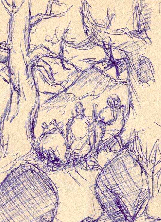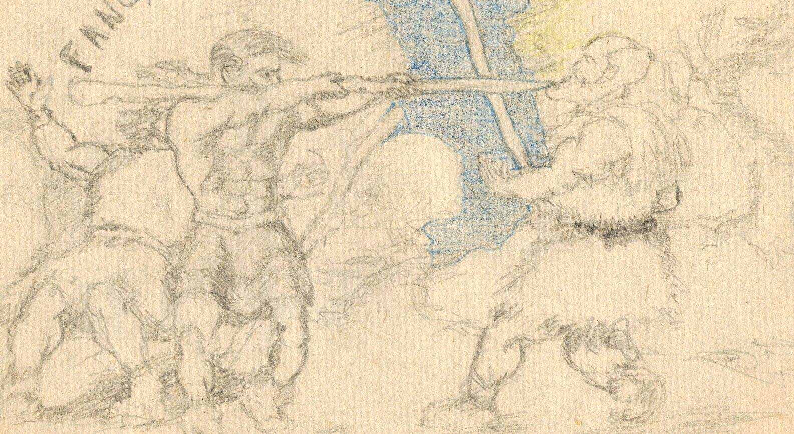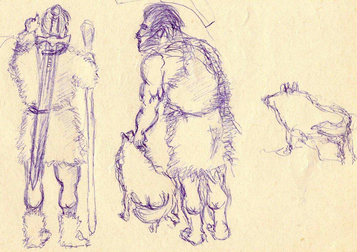Tutaj Perun tłucze swoich współplemieńców kijem samobijem, ale w pierwotnym zamyśle był to fragment "akcji" z zasadzki na Peruna, myślałem wtedy o wynajętych zabójcach, którzy mieli go zlikwidować. Na innych szkicach próbowałem jeszcze rozrysować wszystkie fazy ruchu kija itp. taki slow motion, a może nawet bullet time:)