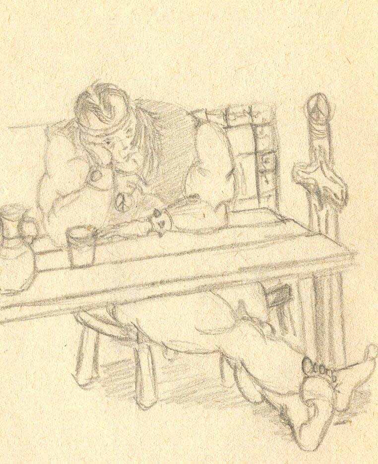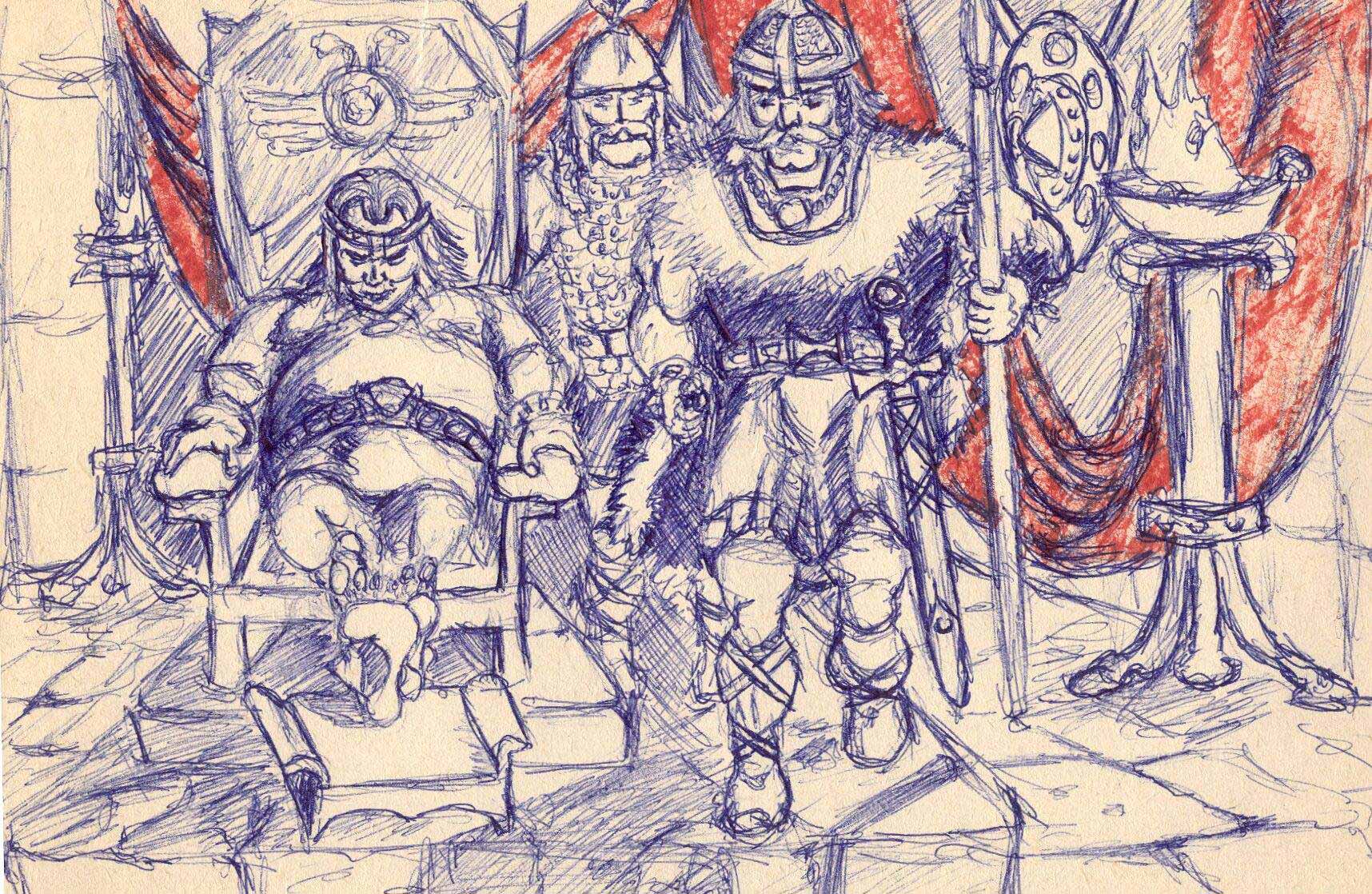 Wizyta u króla, który jest najwyraźniej "zmęczony". Król pijanica. W pierwotnym zamyśle nie było jeszcze Alaryka, myślałem o Zubaranie - imię"pożyczyłem" z gry "Ishar", tak jak Grimzell i Zelorana, a nawet o Conanie, jako zapitym monarsze, nie potrafiącym zapomnieć o Valerii